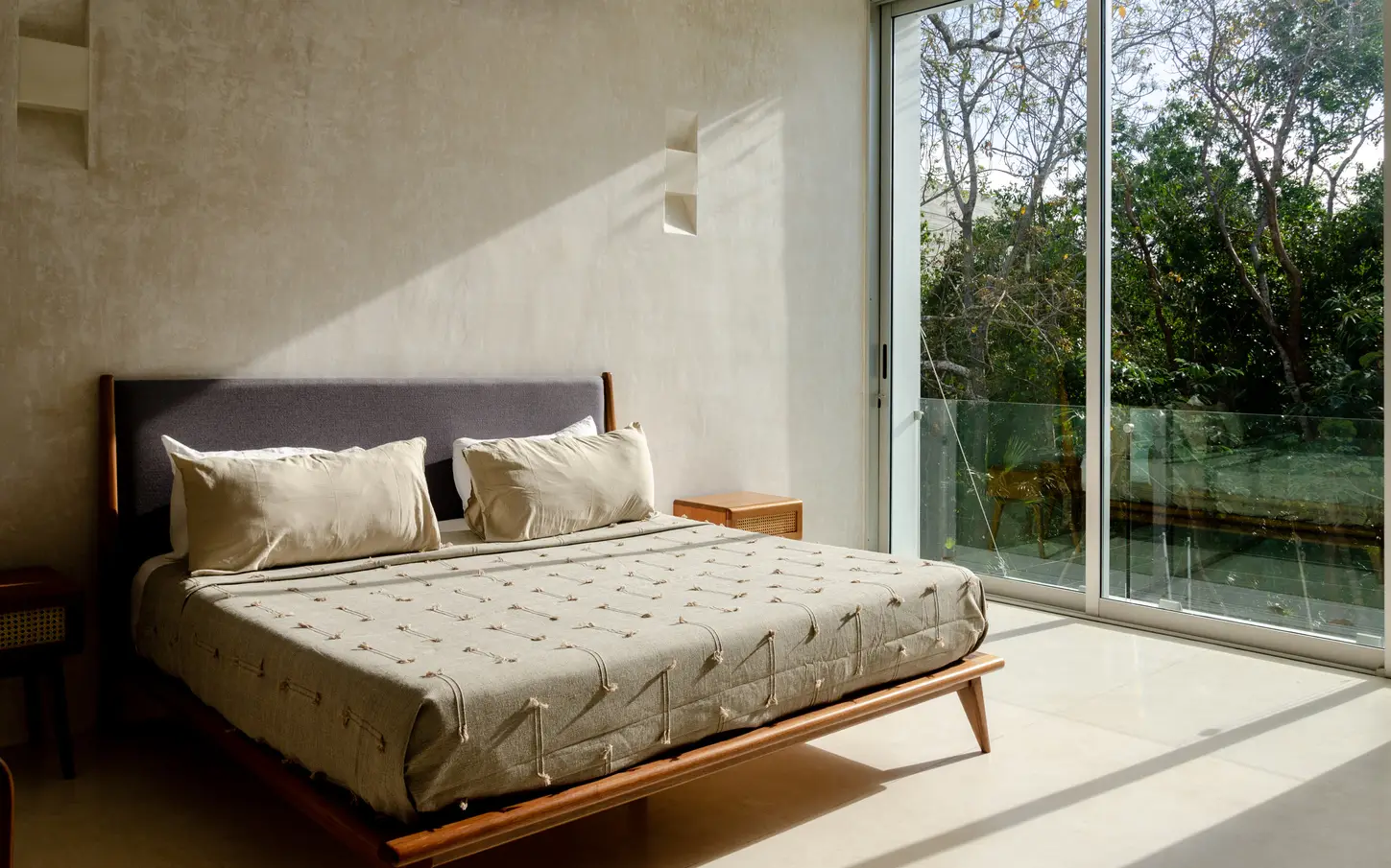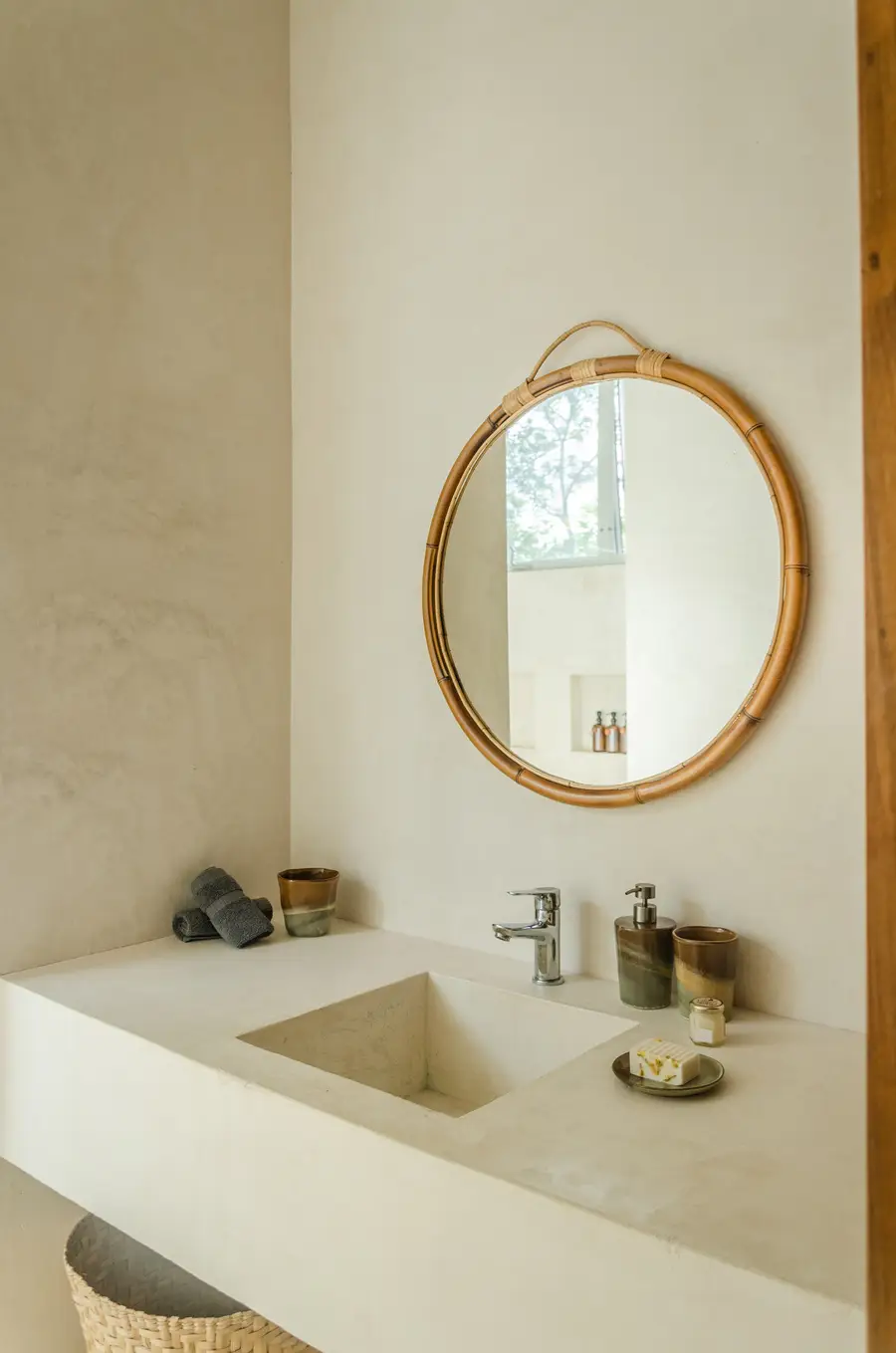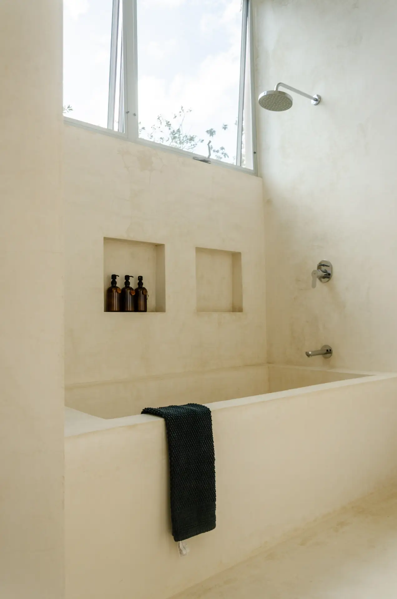 At the center of the living room is a cantilevered staircase inspired by the design of Barragán’s house-museum. The railing, incorporated for practical reasons, was crafted by a local artisan using a technique popular in the 1950s, in which rope braces serve an aesthetic, rather than structural, function.