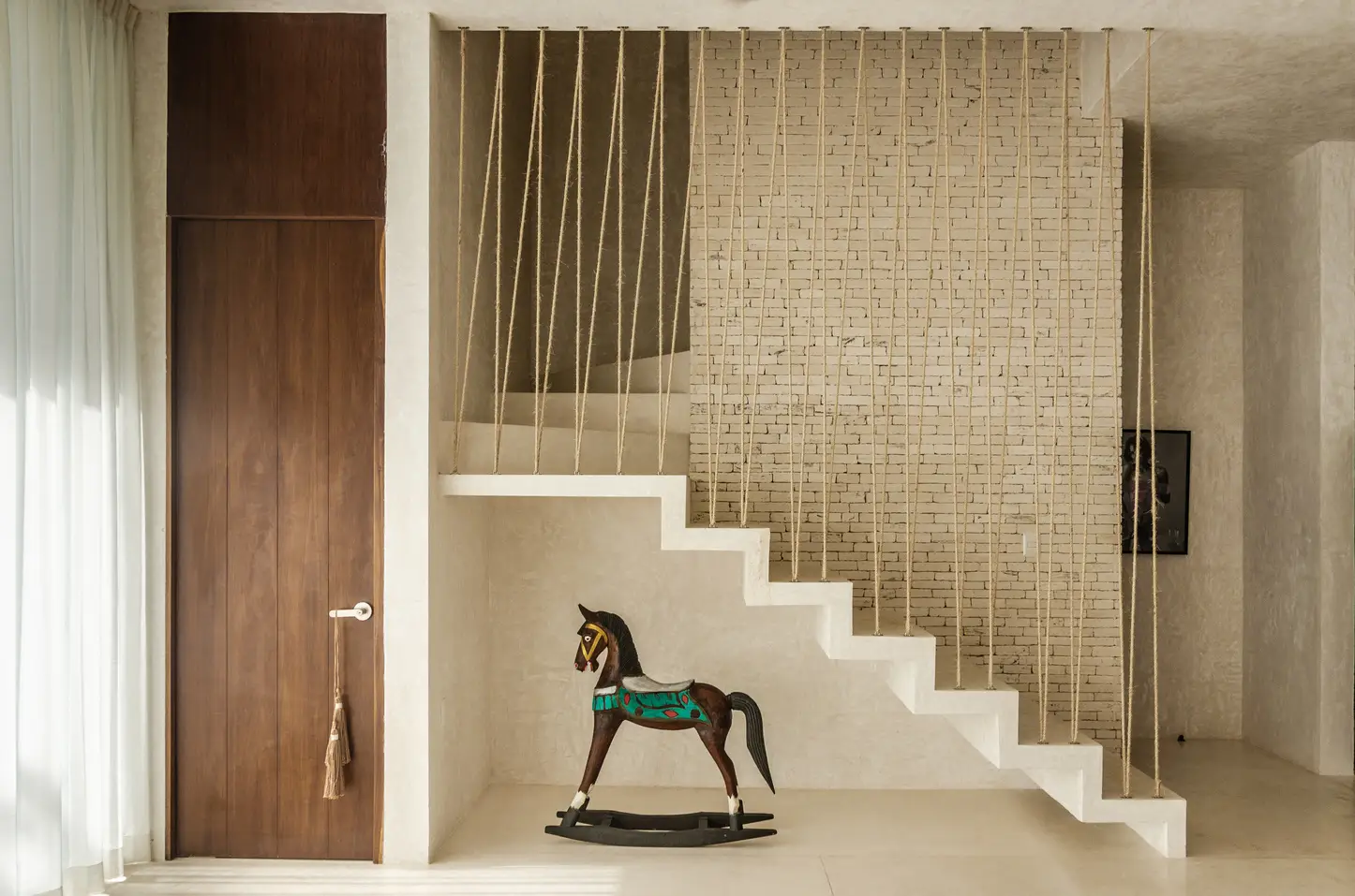 Beneath the staircase, a wooden horse completes the scene, reinforcing the homage to Barragán. This piece connects with his main aesthetic obsessions and serves as an altar or symbolic stage dedicated to his legacy.