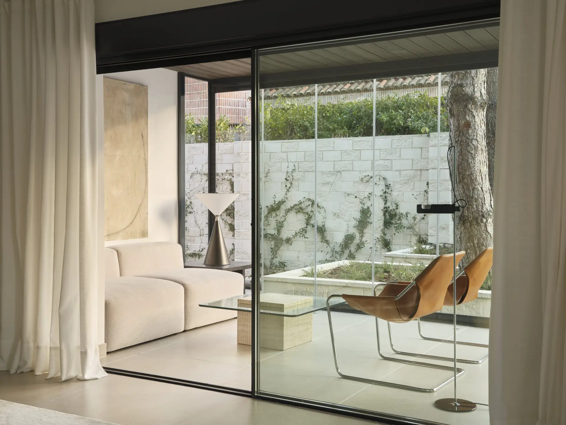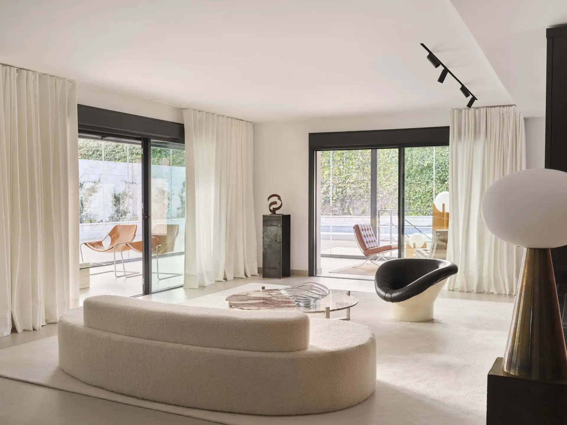 The living room and main areas maintain a sober character with midcentury hints, integrating European and American pieces from the 1950s, 60s, and 70s. The entire project was designed to create open, expansive spaces visually connected to the outdoors.
