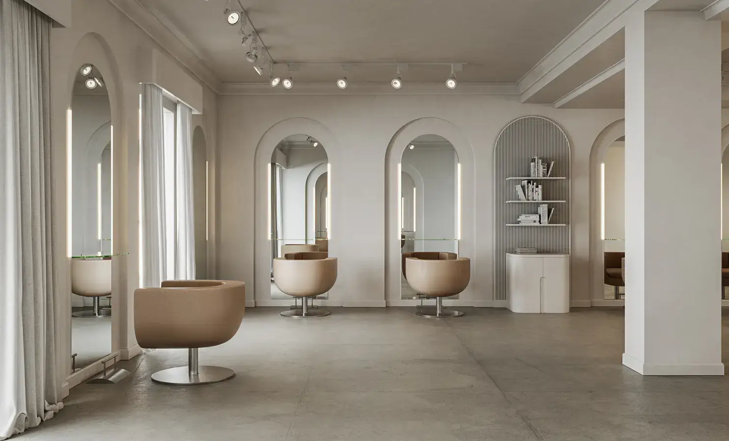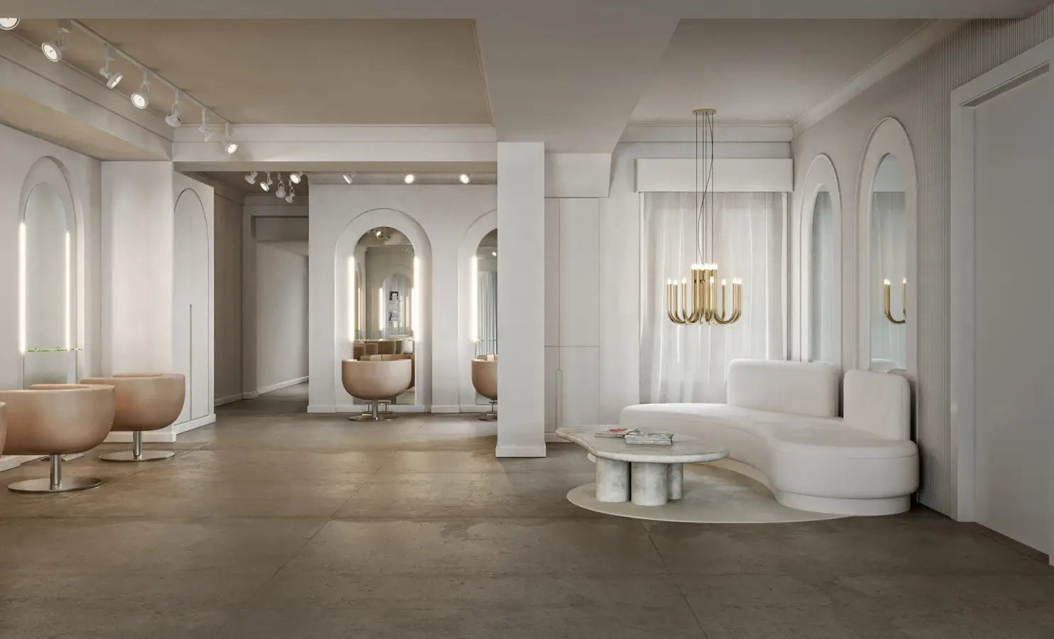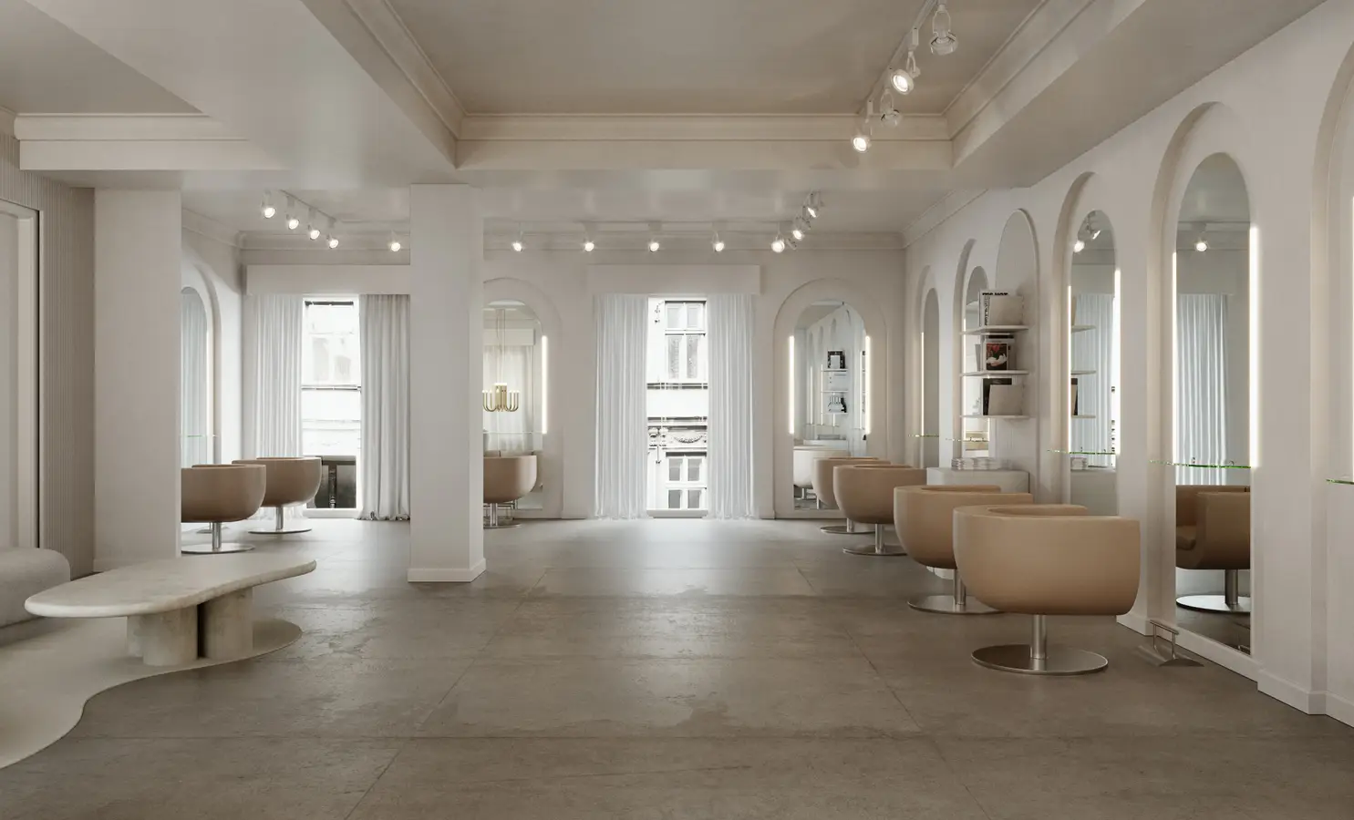 The project for Gabriel Llano Hairdressing Salon, located at Calle de Velázquez 71 in Madrid, stems from a pursuit of formal purity and spatial balance. The proposal combines curved geometries and arches that generate rhythm and continuity, enhancing the sense of depth and flow along the path.