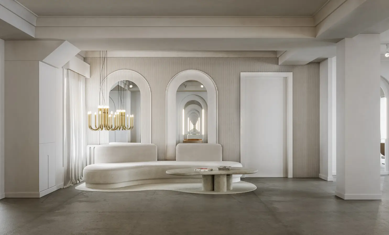 The neutral, luminous palette emphasizes the serenity of the atmosphere, while the soft, organic lines of the furniture dialogue with the architecture to create a welcoming and elegant environment. Lighting, subtly integrated into the architectural elements, adds verticality and accentuates the atmosphere of the space.