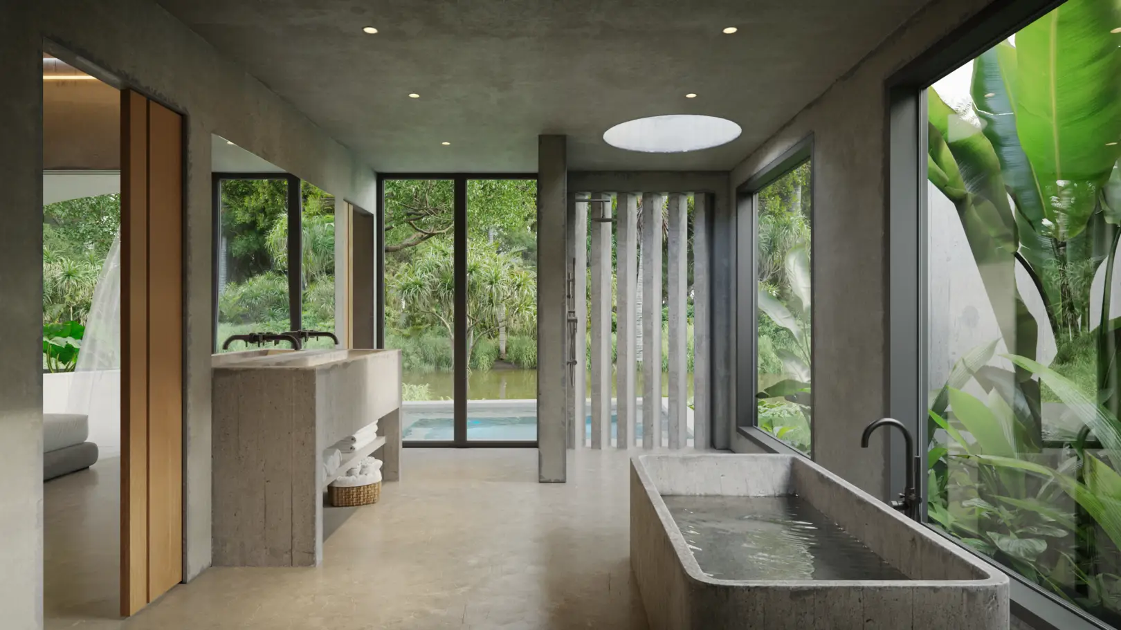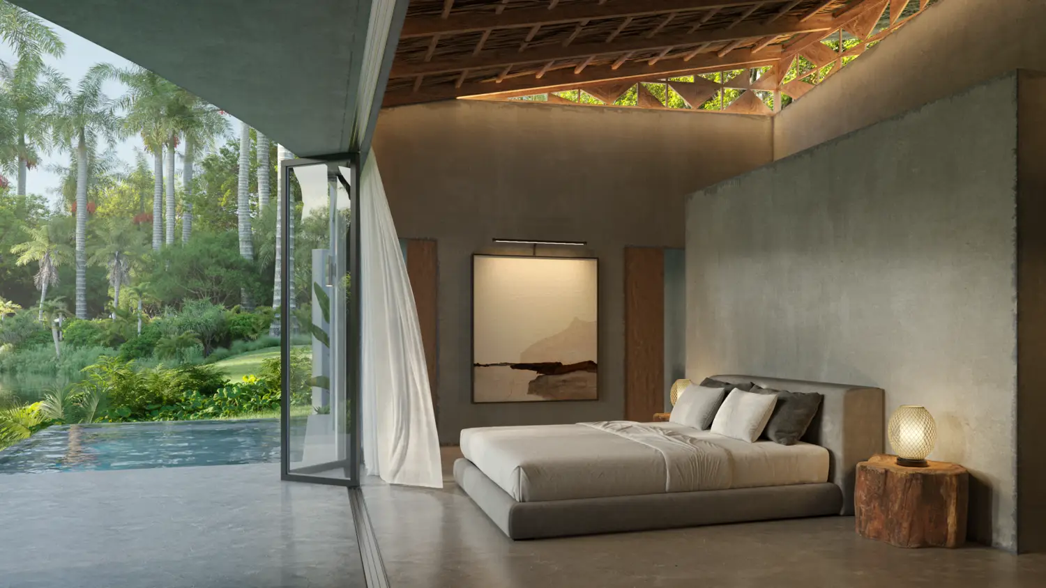 Interiors are designed as open spaces, with large glazed surfaces framing nature and allowing for constant cross-ventilation. Bathrooms integrate carved stone pieces and open showers leading to landscaped patios, blurring the boundaries between indoors and outdoors. Bedrooms feature solid wood furniture and natural fiber textiles, creating a warm, essential atmosphere in dialogue with the landscape.
