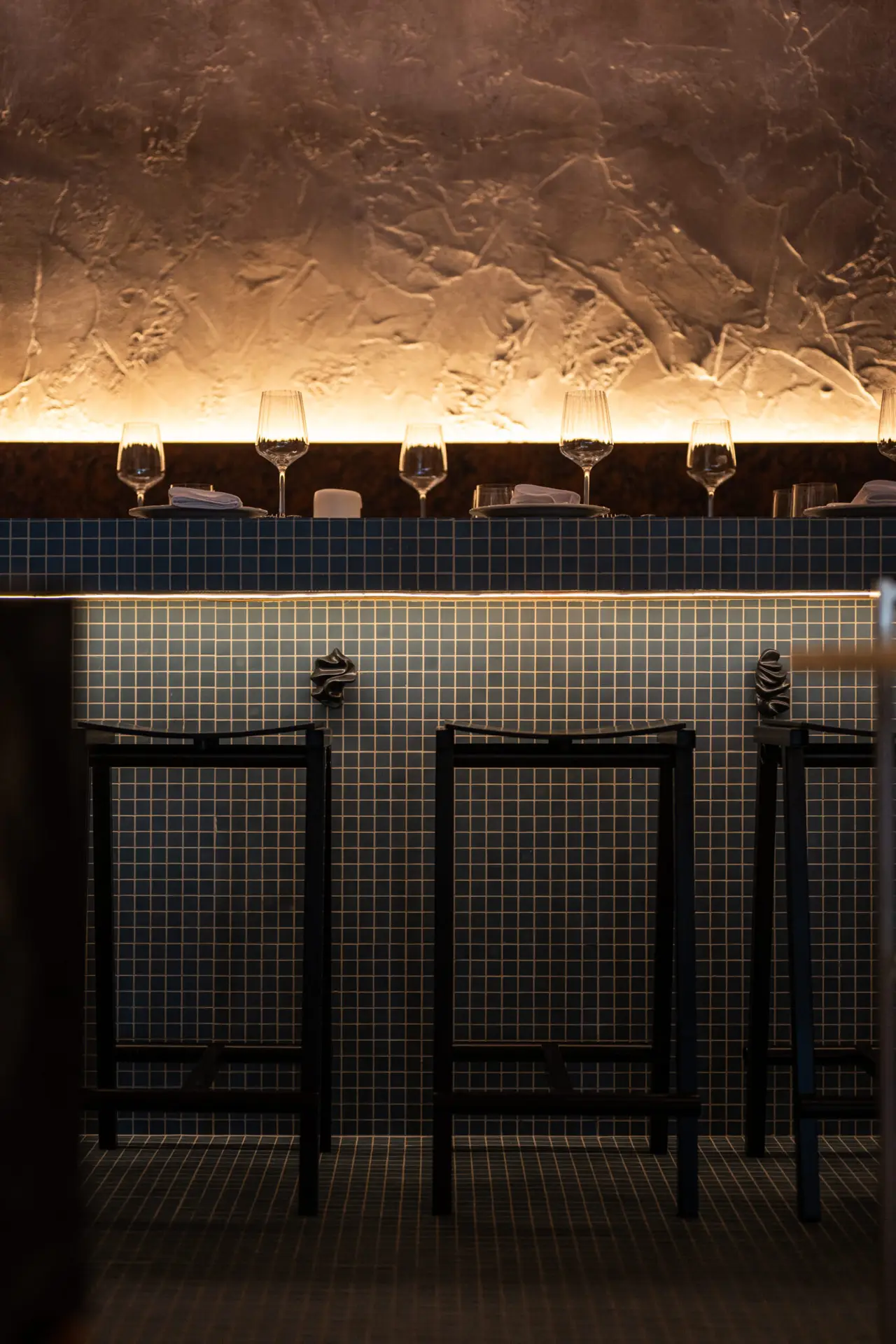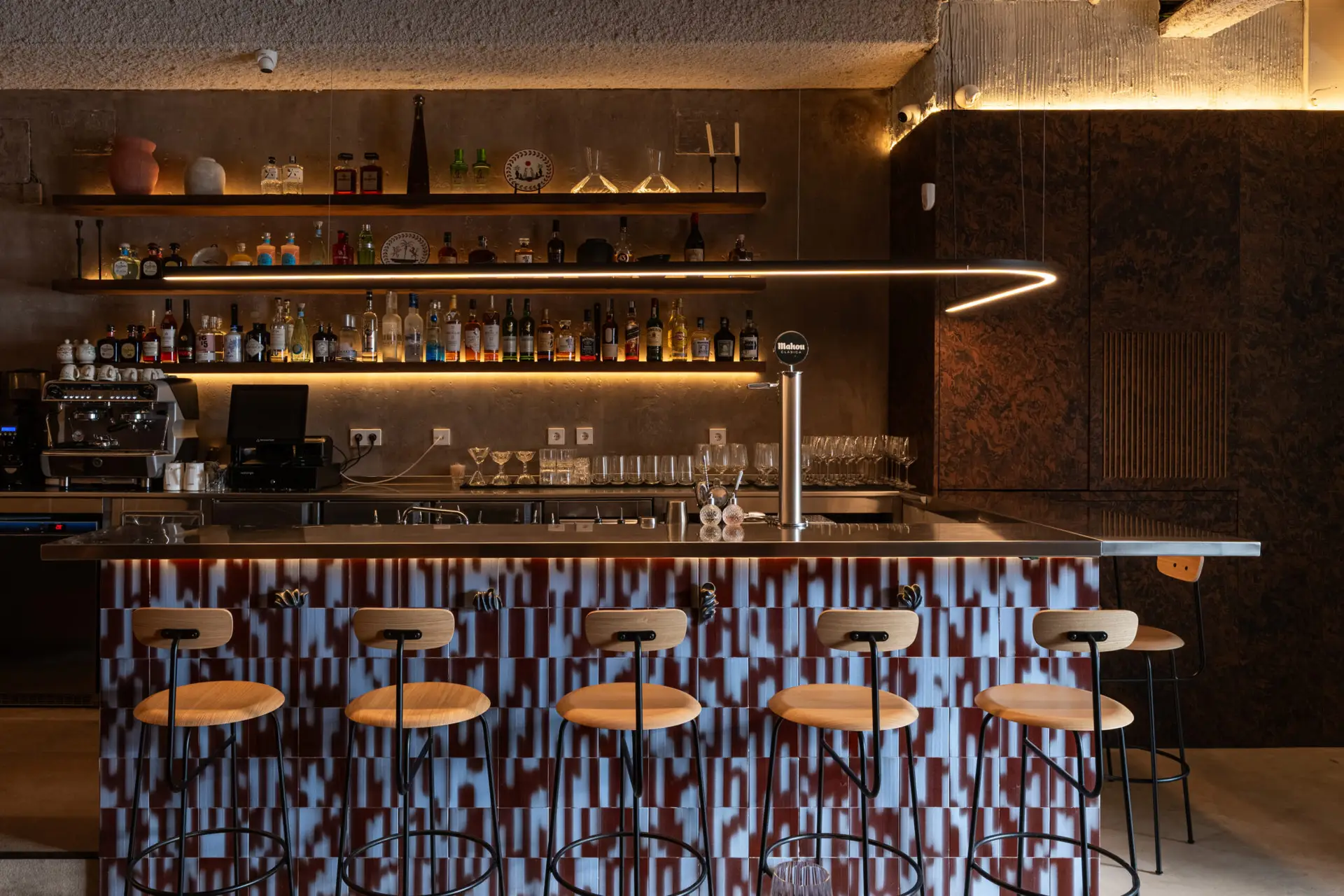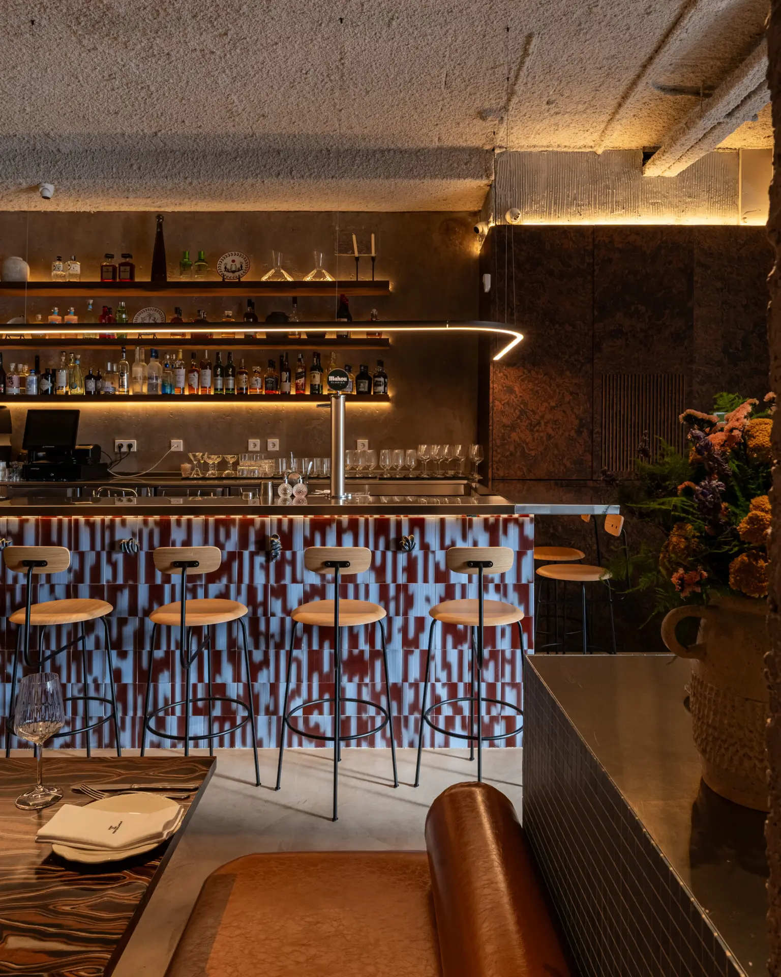 The bar, clad in artisanal ceramics in reddish and white tones, acts as a central meeting point. In contrast, amber leather-upholstered seats and bases covered in blue mosaic bring freshness and a distinctive character to the space.