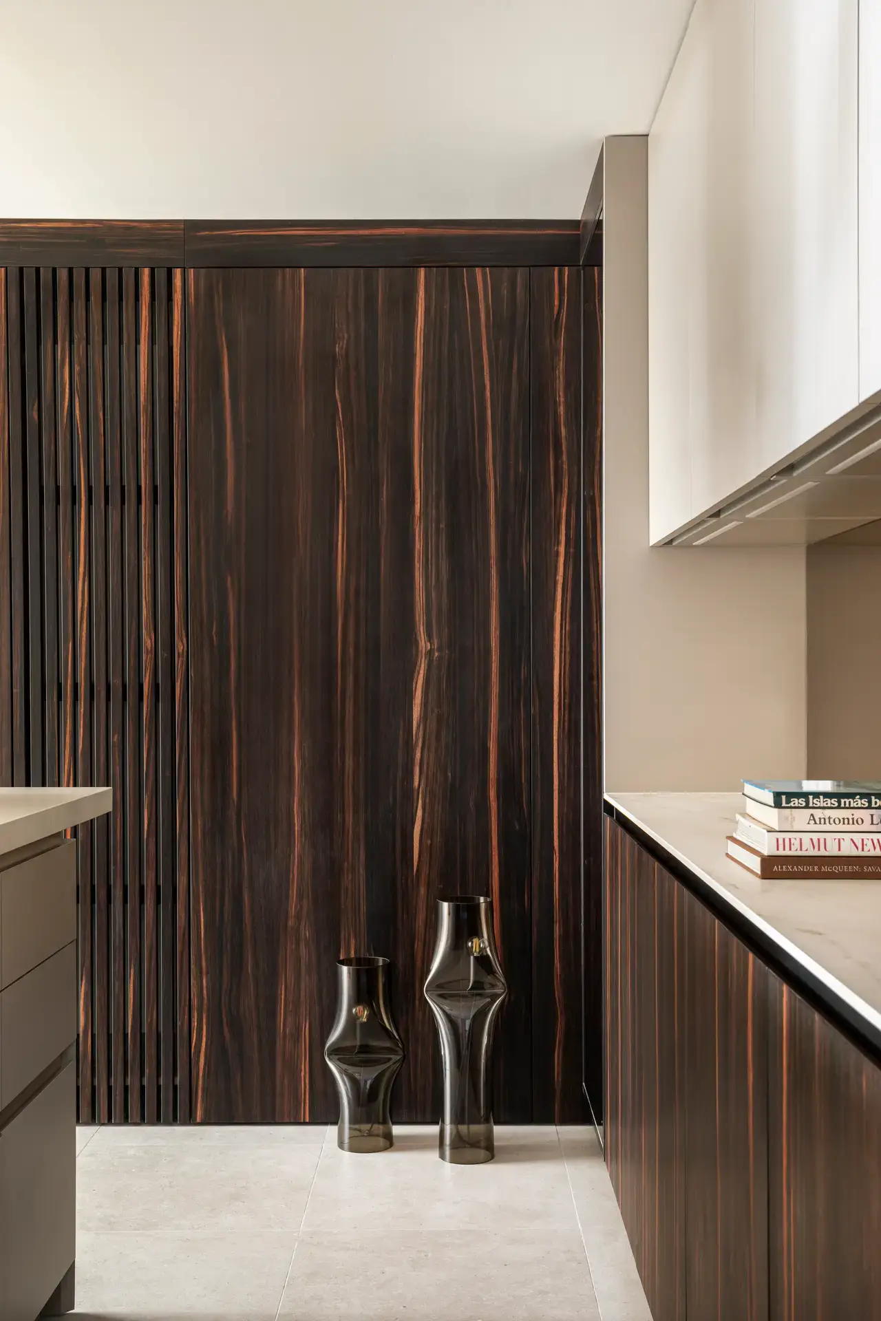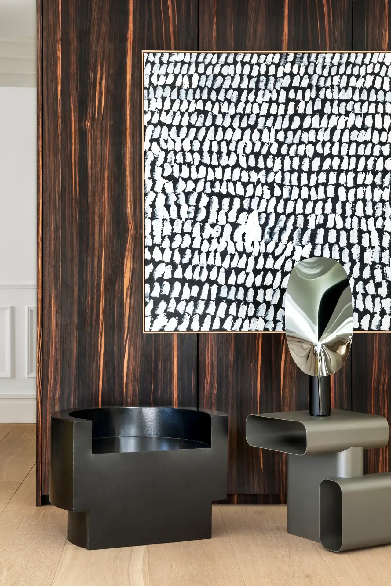 The entrance is defined by a volume reaching the ceiling, interrupting the visitor’s gaze as if it were a wall of Macassar ebony. At the center of this space, a lamp illuminates a set of circular plaster casts, creating an atmosphere reminiscent of James Turrell’s most iconic works.