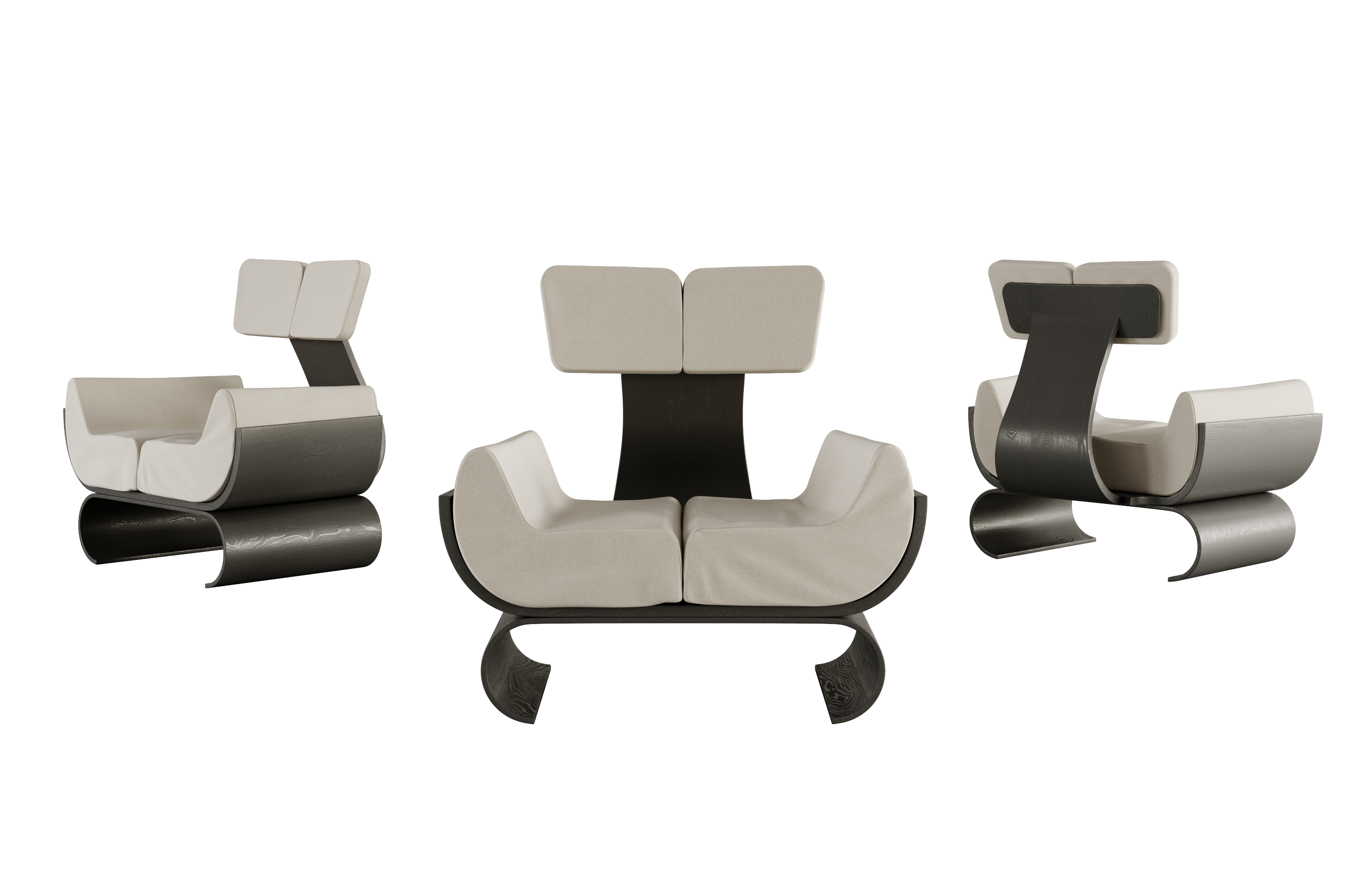 Silla con estructura de laminado de nogal teñido, cojines con costura de pestaña simple. Tapizado a consultar.