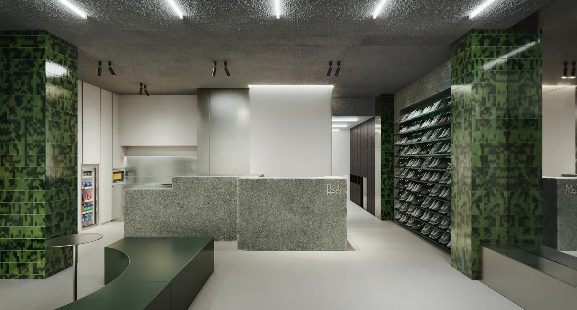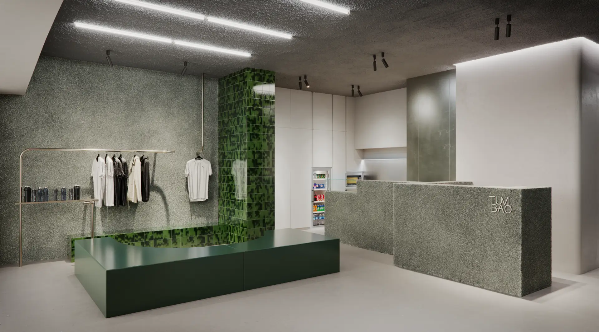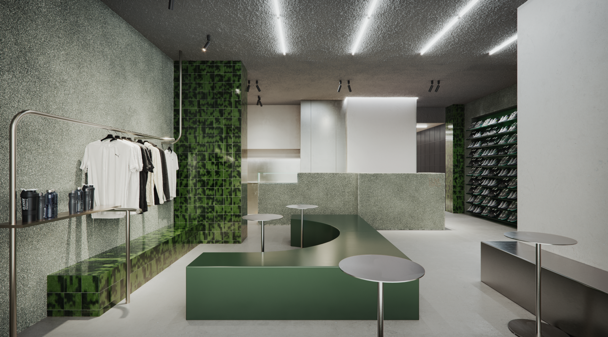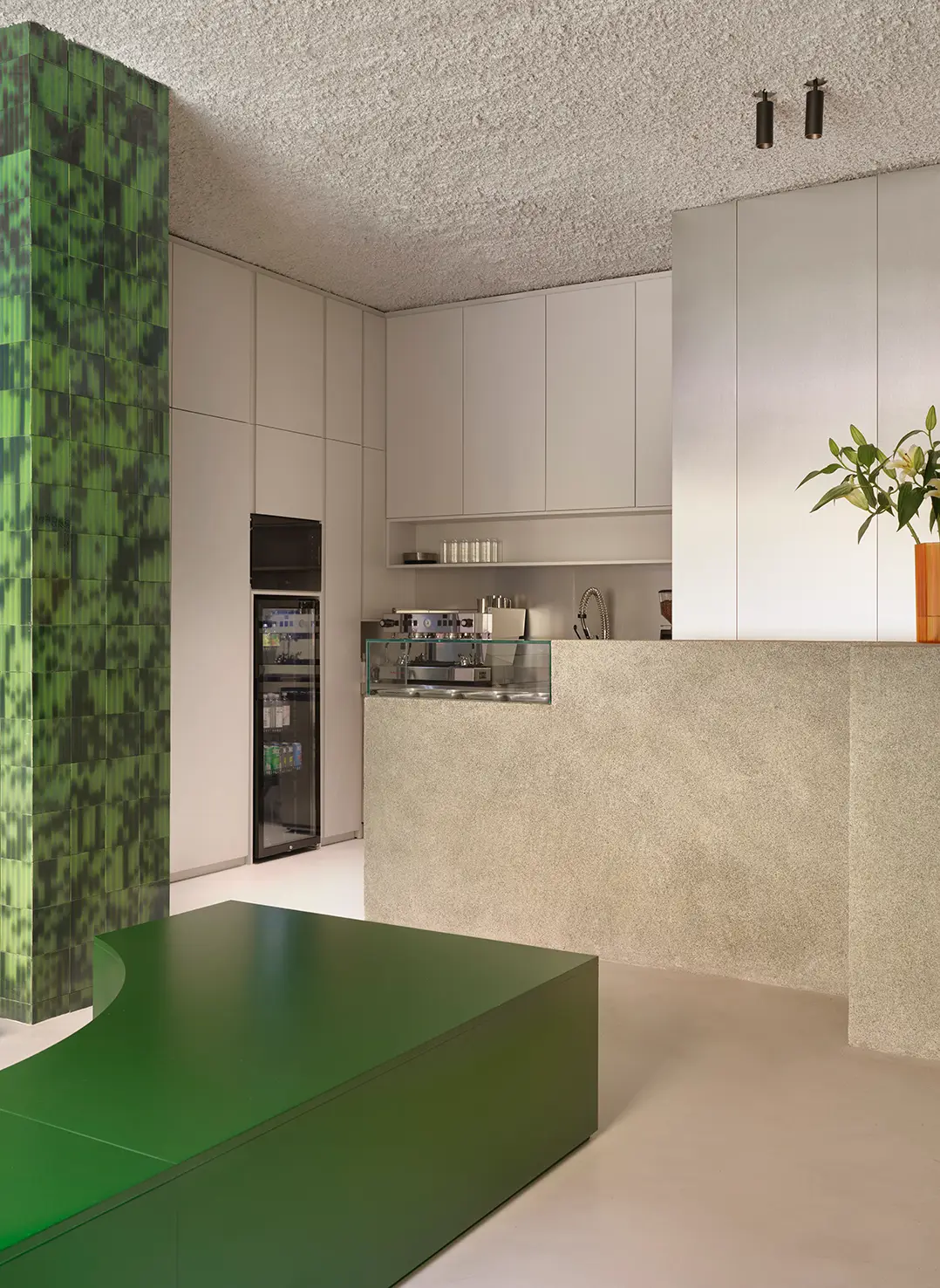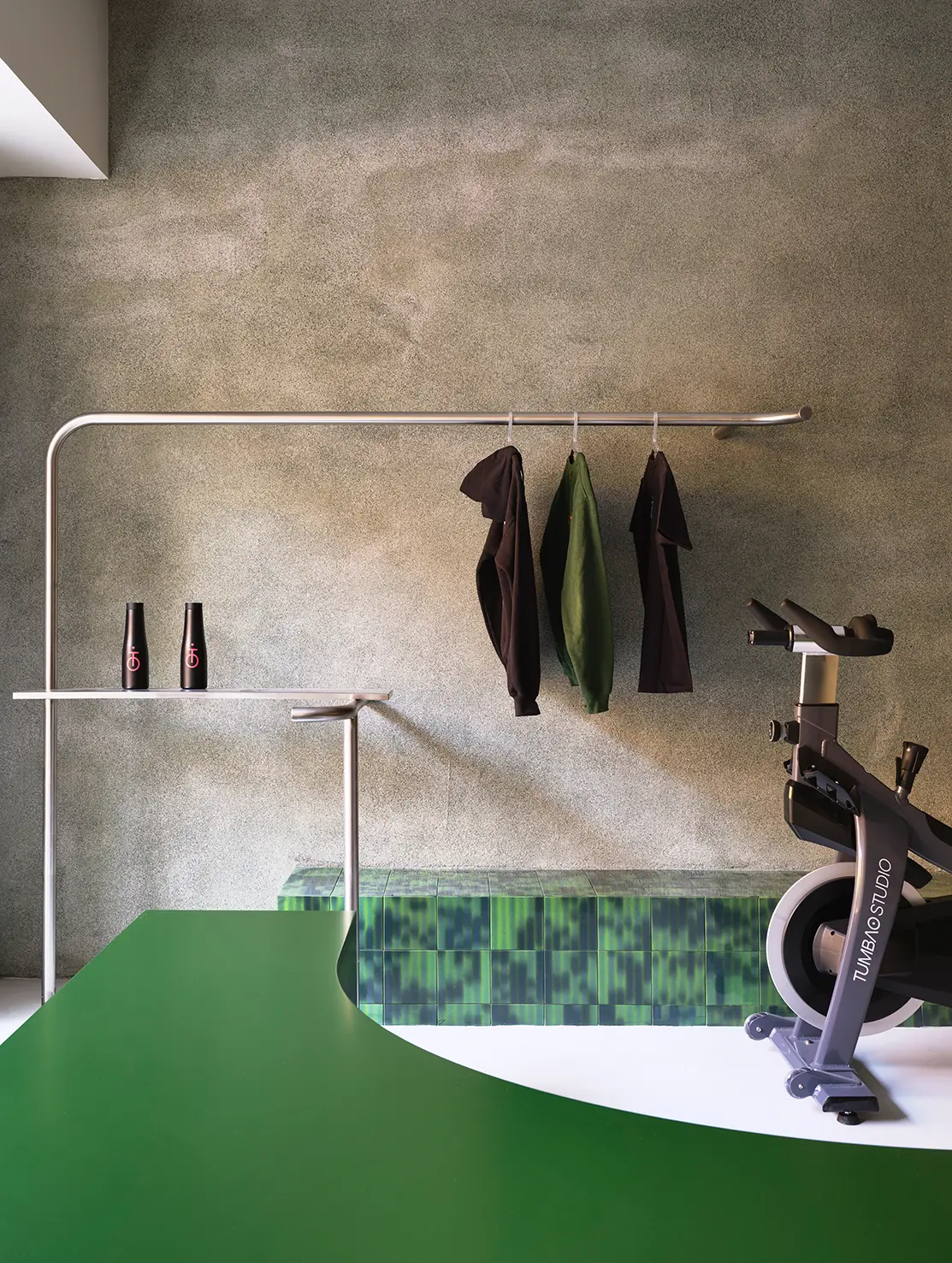 The spatial sequence is articulated through a transitional vestibule featuring a centrally placed circular element that references the cyclical motion of pedaling. Metallic surfaces and stainless steel introduce a sense of dynamism, while the green handcrafted ceramic–clad columns, designed specifically for the project, add rhythm and material depth.