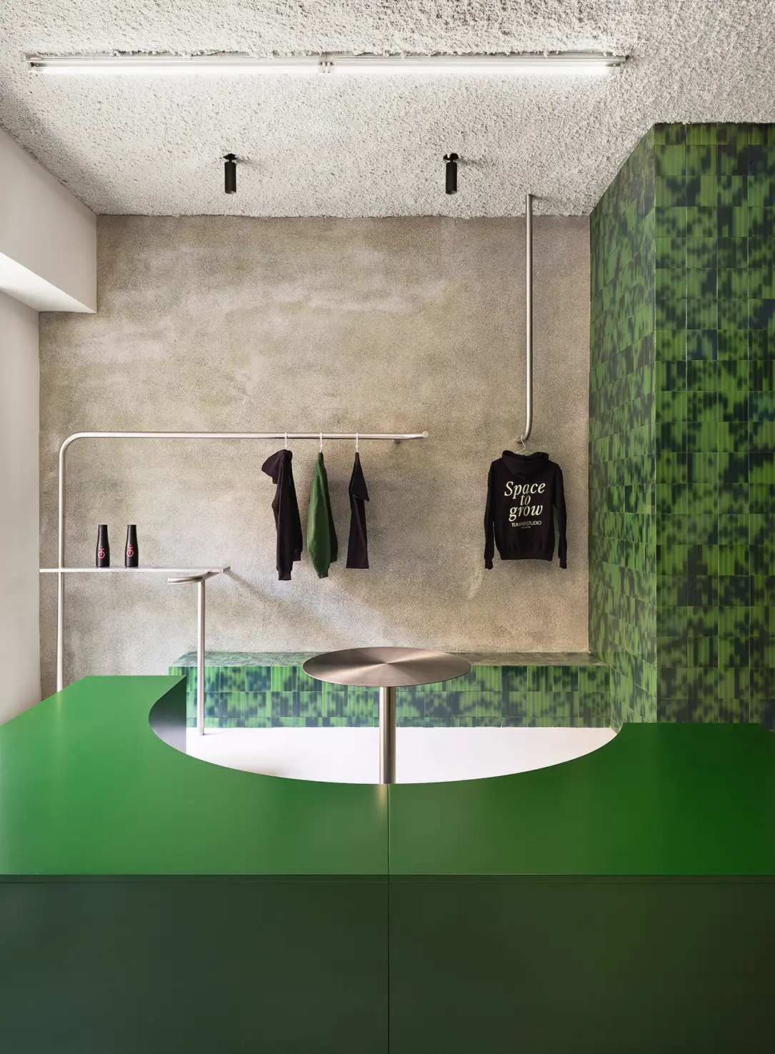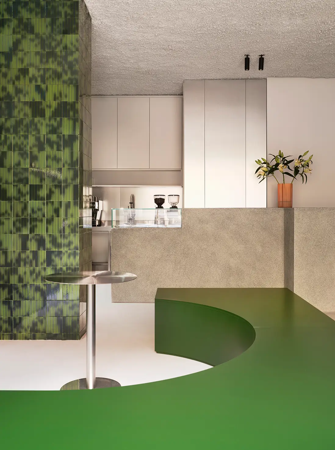 The pillars, clad in artisanal green ceramics, display colored lines that evoke brushstrokes and add dynamism to the ensemble. The ceiling is finished with sprayed rock wool, a resource that enhances the material quality and optimizes the acoustic performance of the space. The floor is finished in microcement, while the bar and other surfaces incorporate natural aggregate, generating contrast and sensory richness.