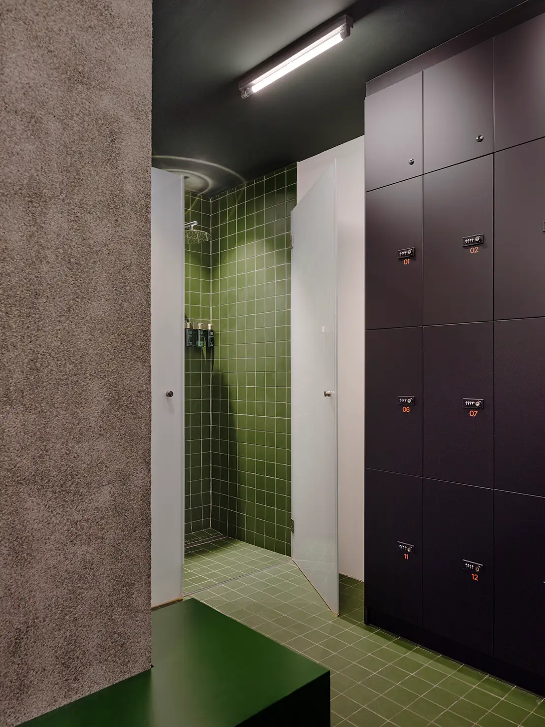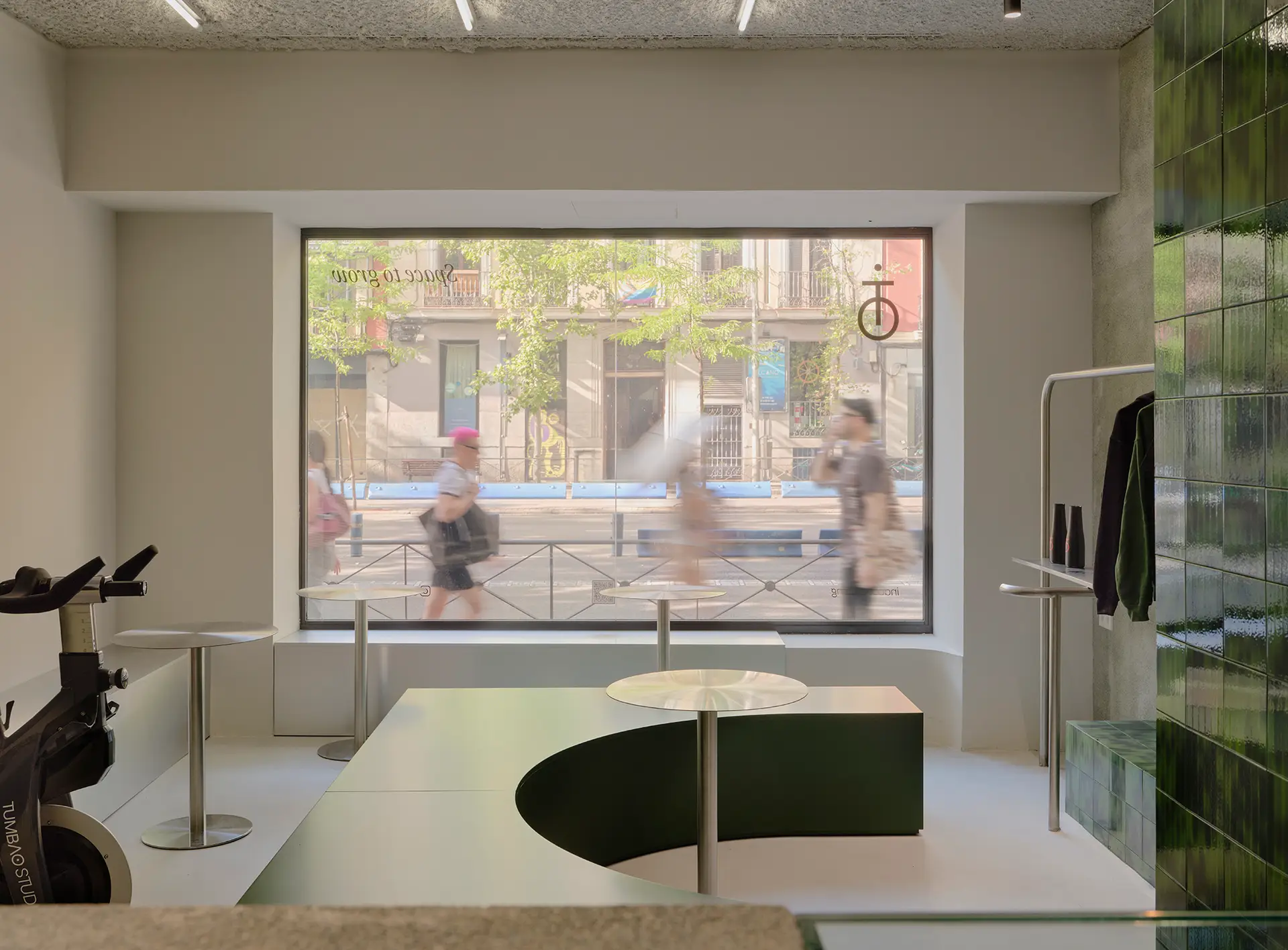 The entrance is organized around a lobby with reception, waiting area, and product display zone. This space acts as a prelude to the main spinning hall, located in the basement. There, darker tones and specific lighting design transform the atmosphere, creating an intense and immersive environment that turns each session into a unique experience.
